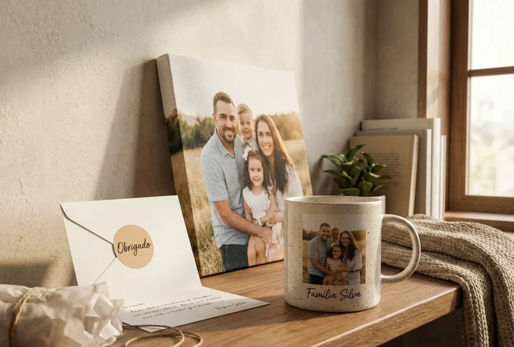 Transforme fotos e memórias em presentes. Canecas, quadros e azulejos personalizados com qualidade fotográfica.